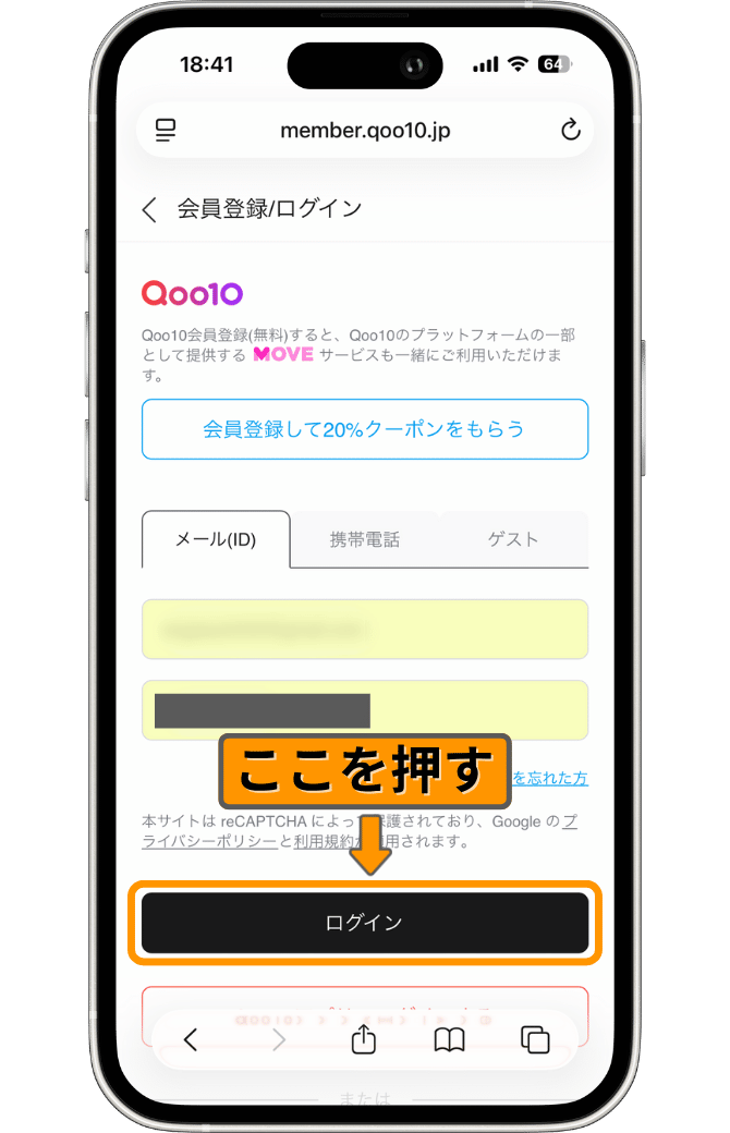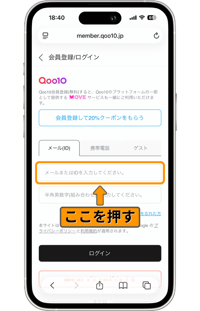 ↓すると、次の画像のようにメアドやパスワードといったログインに必要な情報を入力する画面に切り替わるので、入力欄をタップします。