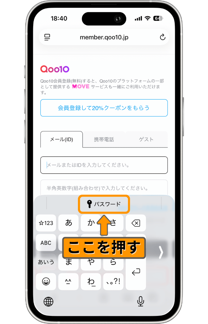 ↓画面下にキーボードが出てきたら、「オレンジ色の枠」で囲った「パスワード」を押してください。