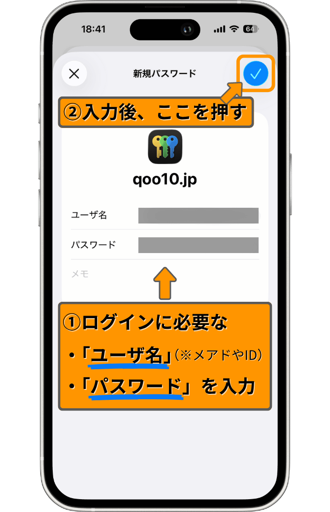 ①登録済みの「ユーザ名」「パスワード」(ログインに必要な情報)を入力して、②画面右上の「チェックマーク」を押してください。