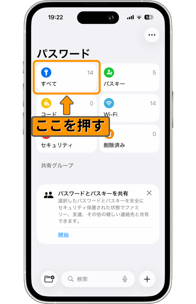 「オレンジ色の枠」で囲われているのが「Passwords」アプリです。まずはこのアプリを開きます。