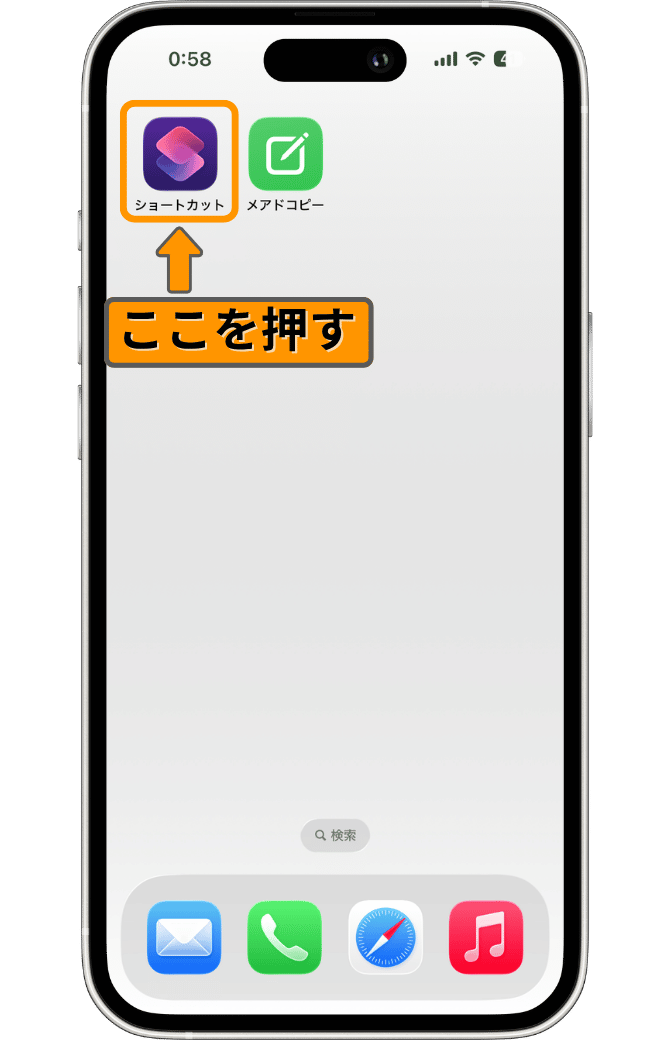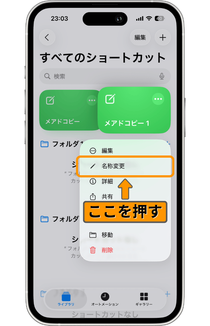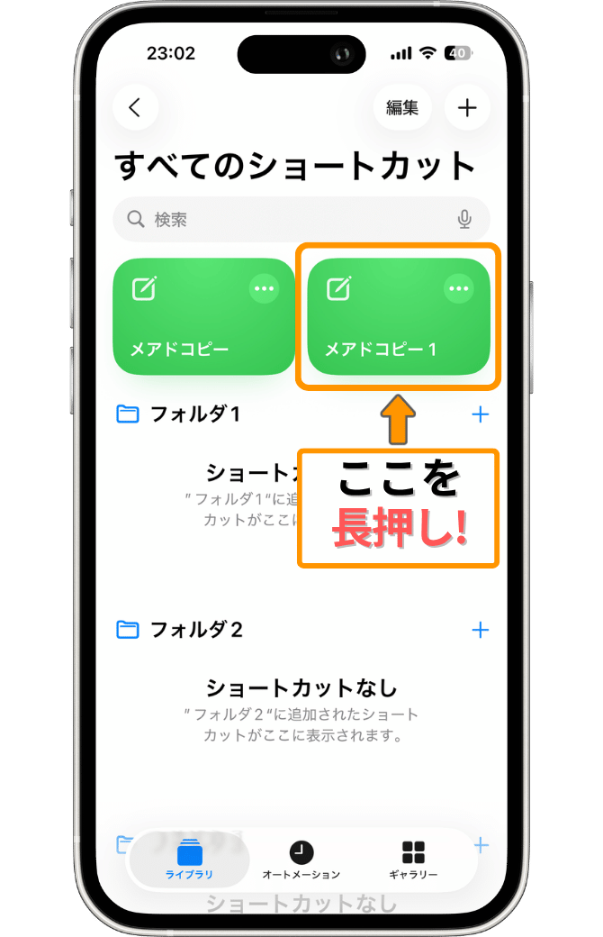 画面が開いたら、「オレンジ色の枠」で囲った、先ほど追加したショートカットを長押ししてください。