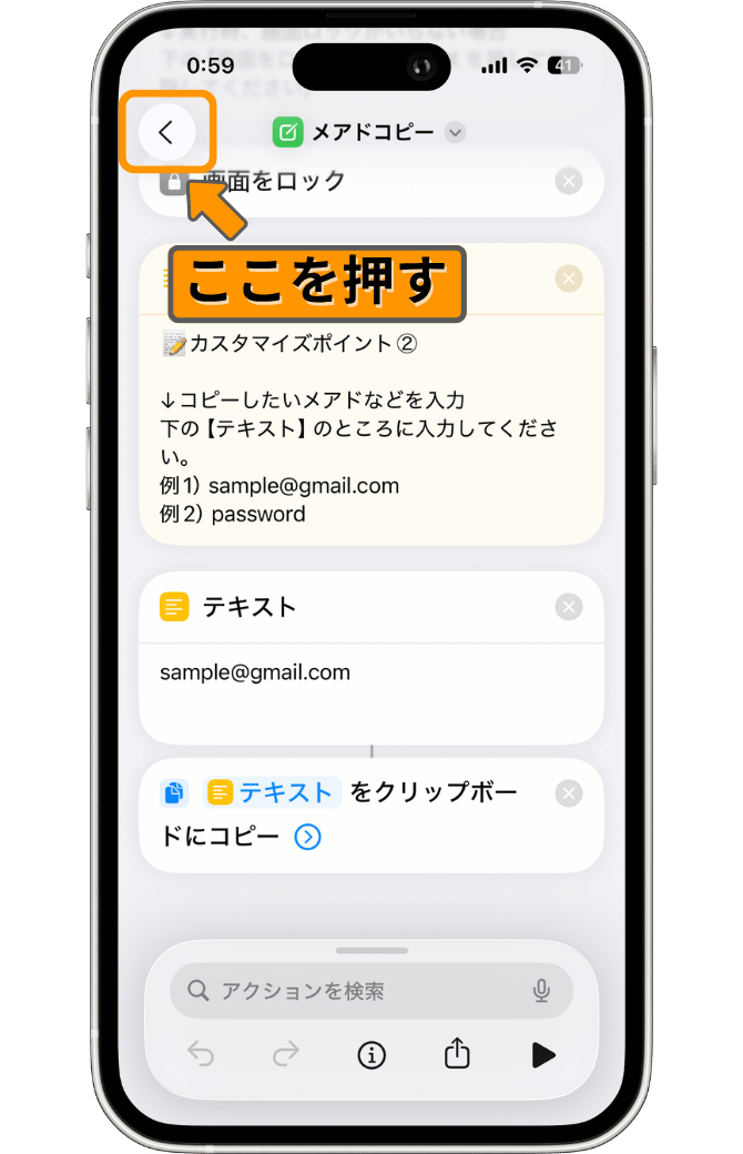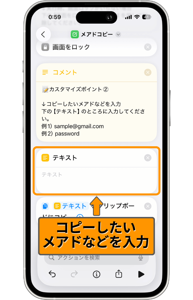 今回は例として、「sample@gmail.com」というアドレスを入力しています。この場合、ショートカット実行時に「sample@gmail.com」がクリップボードにコピーされます。