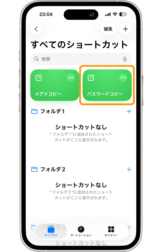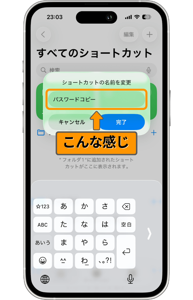 今回は、「パスワードコピー」としました。入力が完了すると、ショートカットの名前が変更されます。