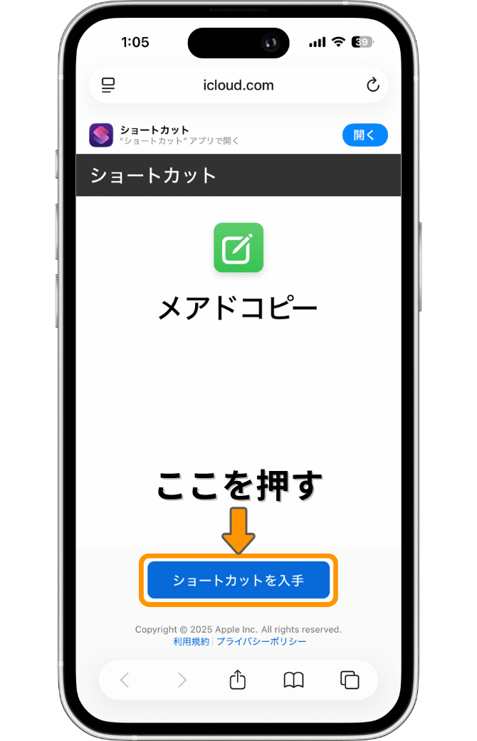 「ショートカットを入手」を押します。すると、ショートカットアプリが起動して次のような画面になるので、