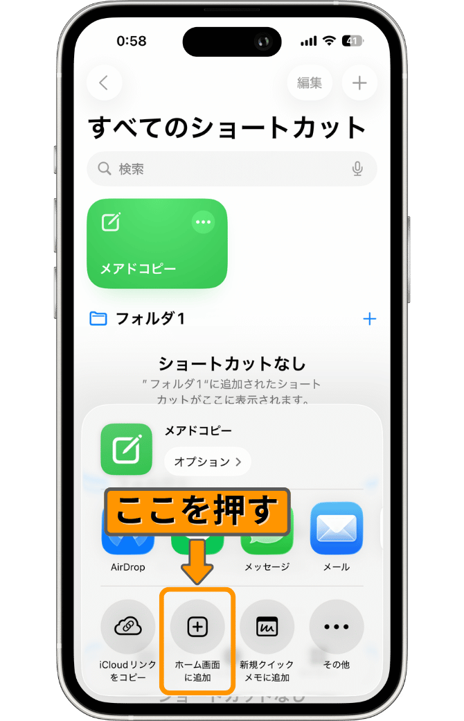 複製が完了すると、次の画像のように「メアドコピー1」というショートカットが隣に作成されます。