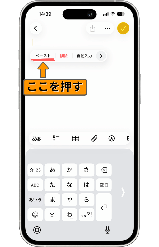 ↓メモアプリを開いて画面をタップすると、次の画像のように「ペースト」、「削除」、「自動入力」といった選択バーが表示されます。